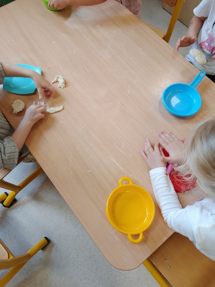 Dnia 9 września 2025 r. w ramach zajęć przedszkolnych z doradztwa zawodowego grupa pięciolatków miała okazję poznać zawód piekarza i cukiernika poprzez zabawy dydaktyczne i ruchowe. Wspólnie odśpiewały rymowankę „Mało nas do pieczenia chleba” podczas zabawy ruchowej oraz pokolorowały rysunki słodkich babeczek, korzystając z własnej wyobraźni. Natomiast 16 września 2025 r. dzieci podczas kolejnych zajęć bawiły się w formowanie bułeczek, chleba i ciasteczek, lepienie ich z ciastoliny. Chętnie opowiadały o swoich „wypiekach”, wcielając się w rolę piekarza. Te działania zostały zrealizowane w ramach projektu finansowanego z Funduszy UE.
